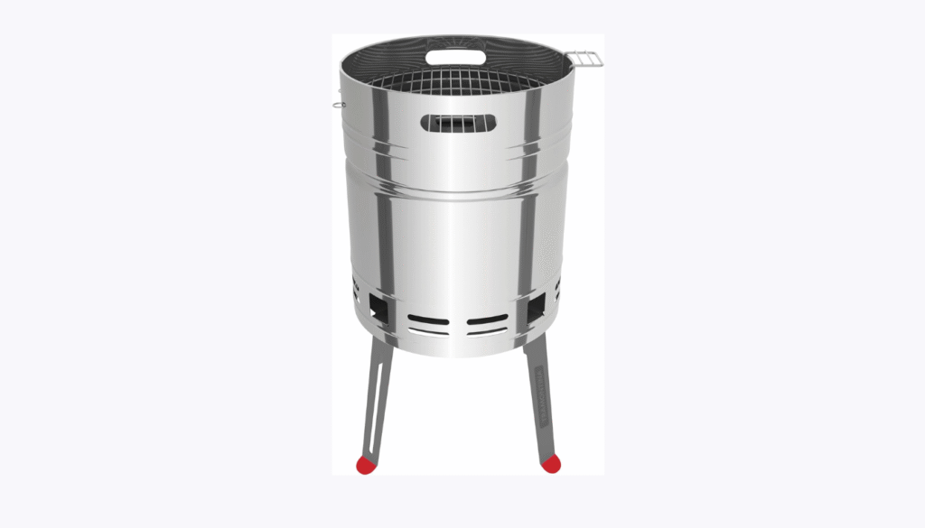 Outro diferencial é o prato removível em alumínio que facilita a coleta e descarte das cinzas, tornando a limpeza rápida e simples. As alças em nylon reforçado, resistentes ao calor, e as rodas robustas conferem praticidade no transporte. Com uma avaliação média de 4,7 de cinco estrelas, é elogiada pela eficiência e portabilidade. O preço aproximado é de R$ 1.700.