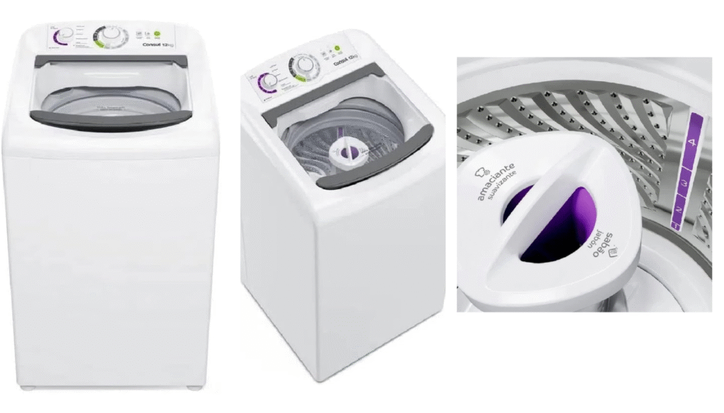 A Consul CWH12, com seus 12 kg de capacidade, é outra opção popular. Ela é versátil, servindo tanto para peças delicadas quanto para itens mais pesados como tênis e edredons, com ciclos específicos para cada um. São 16 programas de lavagem disponíveis. O cesto em inox contribui para a limpeza, e o Dual Dispenser permite separar sabão e amaciante. A função Nível Fácil ajuda a indicar a quantidade correta de água, e o dosador de sabão evita desperdícios. Para quem se preocupa com o uso consciente da água, a lavagem Econômica permite reutilizar a água. E nos dias sem sol, a função Mais Secas ajuda a reduzir o tempo de secagem das roupas.