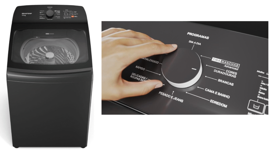 A Brastemp BWK é uma excelente escolha para quem luta contra manchas difíceis. Disponível em capacidades de 12, 13, 14 e 15 kg, ela se destaca pelo ciclo Tira Manchas Advanced, que promete remover mais de 40 tipos de manchas. Além disso, conta com o ciclo Antibolhas, que cuida melhor dos tecidos, e o ciclo Cores Duradouras, que ajuda a evitar o desbotamento. Para quem tem pele sensível, o ciclo Roupas Delicadas e o ciclo Edredom com enxágue extra minimizam o risco de irritações causadas por resíduos de sabão. O cesto interno em inox e o controle de nível de água são outros pontos positivos. Os usuários avaliam esta máquina com 4,5 estrelas.