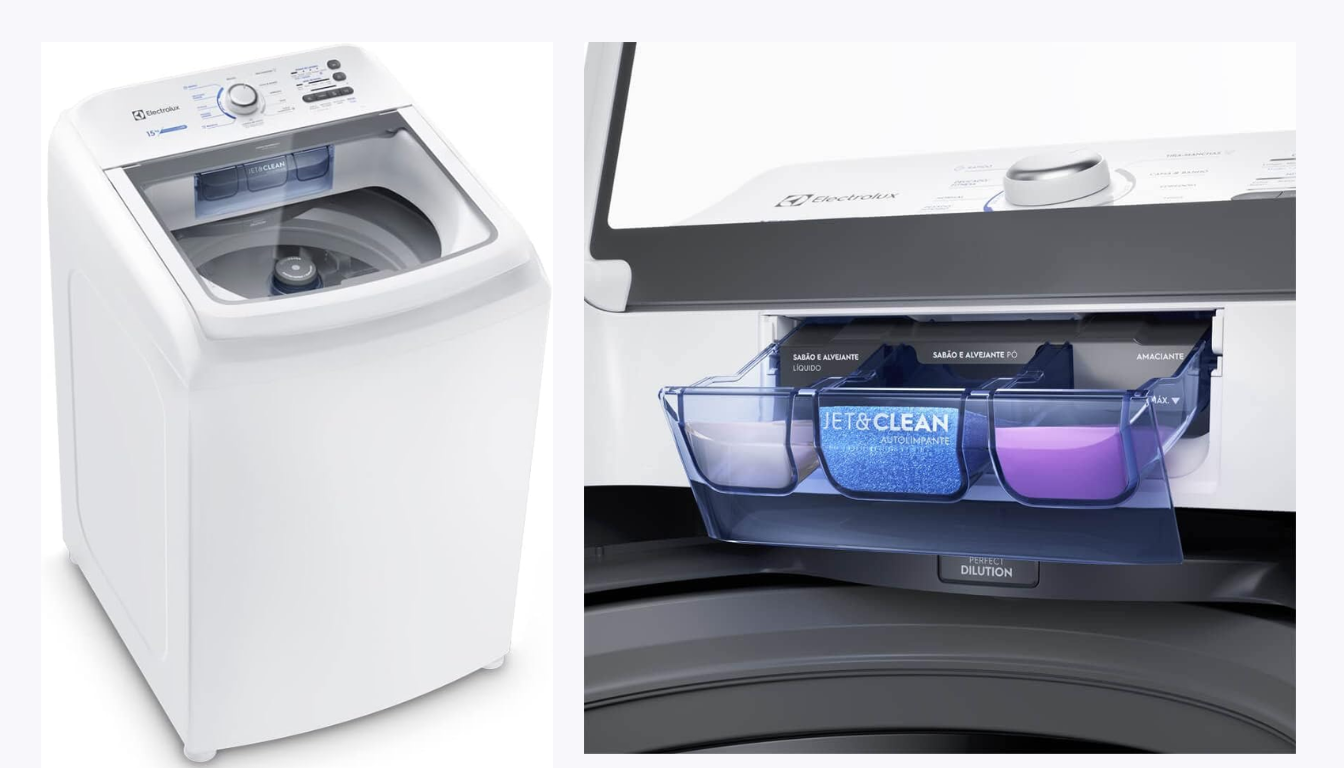 A Electrolux LAC, encontrada em 10,5 kg, 12 kg e 13 kg, se destaca pela limpeza sem manchas de sabão. Seu dispenser autolimpante e o sistema de diluição inteligente dissolvem bem os produtos antes de chegar às roupas. Os compartimentos separados para sabão e amaciante oferecem flexibilidade. As funções Turbo Agitação e Turbo Secagem prometem limpeza profunda e menos tempo no varal. Ela também tem programas específicos para edredons e tênis. Outras conveniências incluem reutilização de água, limpeza fácil do cesto e um painel inteligente.