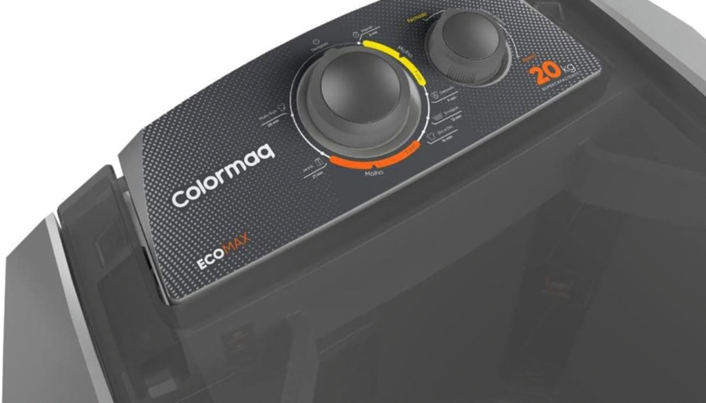 Para tornar a experiência de lavagem ainda mais simples, o Colormaq 20kg conta com um dispenser duplo, permitindo a adição de sabão e amaciante de maneira organizada. Além disso, a saída automática de água é um recurso que facilita o escoamento da água ao final do ciclo, eliminando a necessidade de inclinar o aparelho ou manusear mangueiras de forma complexa. São detalhes que contribuem para a conveniência no uso diário.