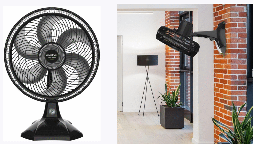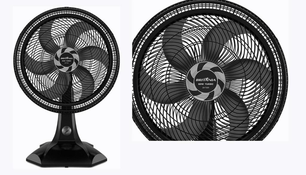 E em primeiro lugar, temos o ventilador 2 em 1 Maxx Force Turbo Britânia. Este modelo é bem versátil e se adapta fácil ao seu espaço, podendo ser usado em mesas, bancadas ou fixado na parede. Ele tem três velocidades, três níveis de inclinação e oscilação automática para você direcionar o vento como quiser. Sua hélice de seis pás tem 40 cm de diâmetro e 150 W de potência, garantindo um ótimo desempenho em ambientes quentes. Ele também tem um motor com proteção contra superaquecimento, que desliga sozinho se esquentar demais, e grades com trava de segurança. O modelo ainda tem um lugar para guardar o fio, deixando tudo mais prático. Os consumidores elogiam sua potência, eficiência e facilidade de montar. O Maxx Force Turbo é considerado uma das melhores opções para quem busca qualidade e bom desempenho. Ele recebeu 4,8 de 5 estrelas e custa em torno de R$ 150.