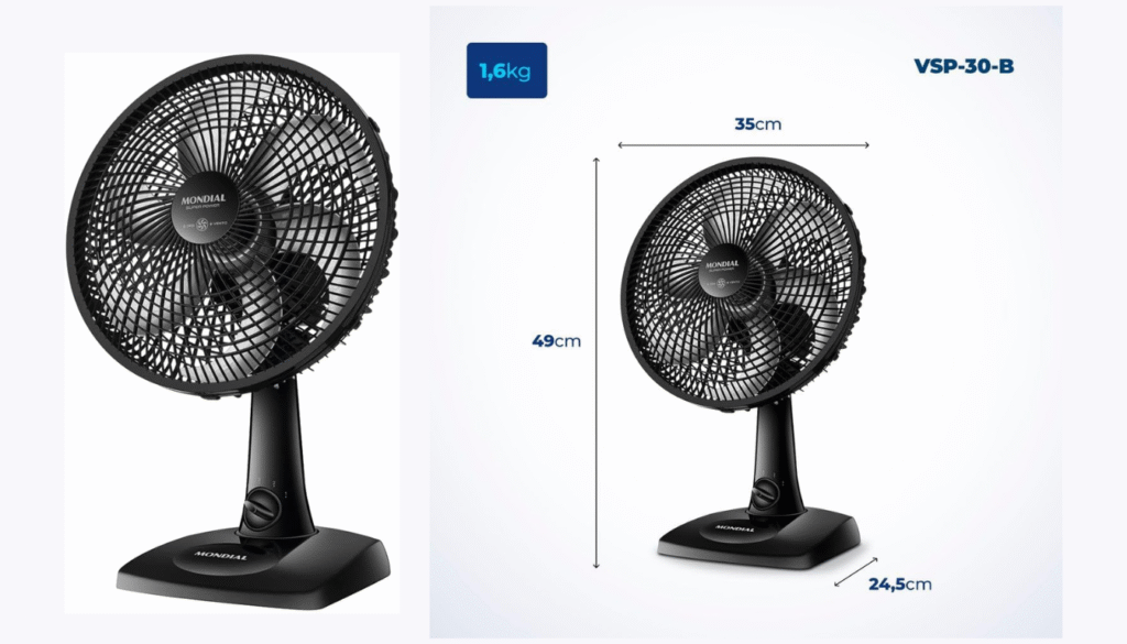 Em terceiro lugar, temos o ventilador de mesa Mondial 6 Pás VSP-40-B. É uma boa opção para deixar o ambiente mais fresco e arejado. Com 40 cm de diâmetro e seis pás, ele move bastante ar sem fazer muito barulho, sendo bom para usar em vários cômodos da casa. O modelo tem três níveis de velocidade e um sistema que faz ele girar para espalhar o vento pelo espaço. A alça atrás facilita o transporte, e as grades que saem tornam a limpeza simples. Ele é compacto, potente e fácil de montar. Os consumidores gostam muito dele pela eficiência, design moderno e praticidade. Recebeu 4,6 de 5 estrelas e custa em torno de R$ 180.