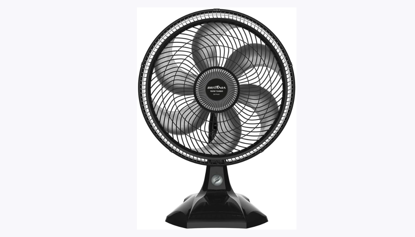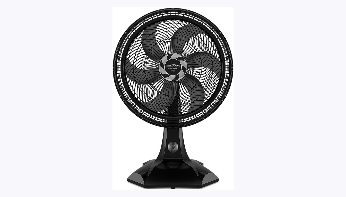 E em primeiro lugar, temos o ventilador 2 em 1 Maxx Force Turbo Britânia. Este modelo é bem versátil e se adapta fácil ao seu espaço, podendo ser usado em mesas, bancadas ou fixado na parede. Ele tem três velocidades, três níveis de inclinação e oscilação automática para você direcionar o vento como quiser. Sua hélice de seis pás tem 40 cm de diâmetro e 150 W de potência, garantindo um ótimo desempenho em ambientes quentes. Ele também tem um motor com proteção contra superaquecimento, que desliga sozinho se esquentar demais, e grades com trava de segurança. O modelo ainda tem um lugar para guardar o fio, deixando tudo mais prático. Os consumidores elogiam sua potência, eficiência e facilidade de montar. O Maxx Force Turbo é considerado uma das melhores opções para quem busca qualidade e bom desempenho. Ele recebeu 4,8 de 5 estrelas e custa em torno de R$ 150.