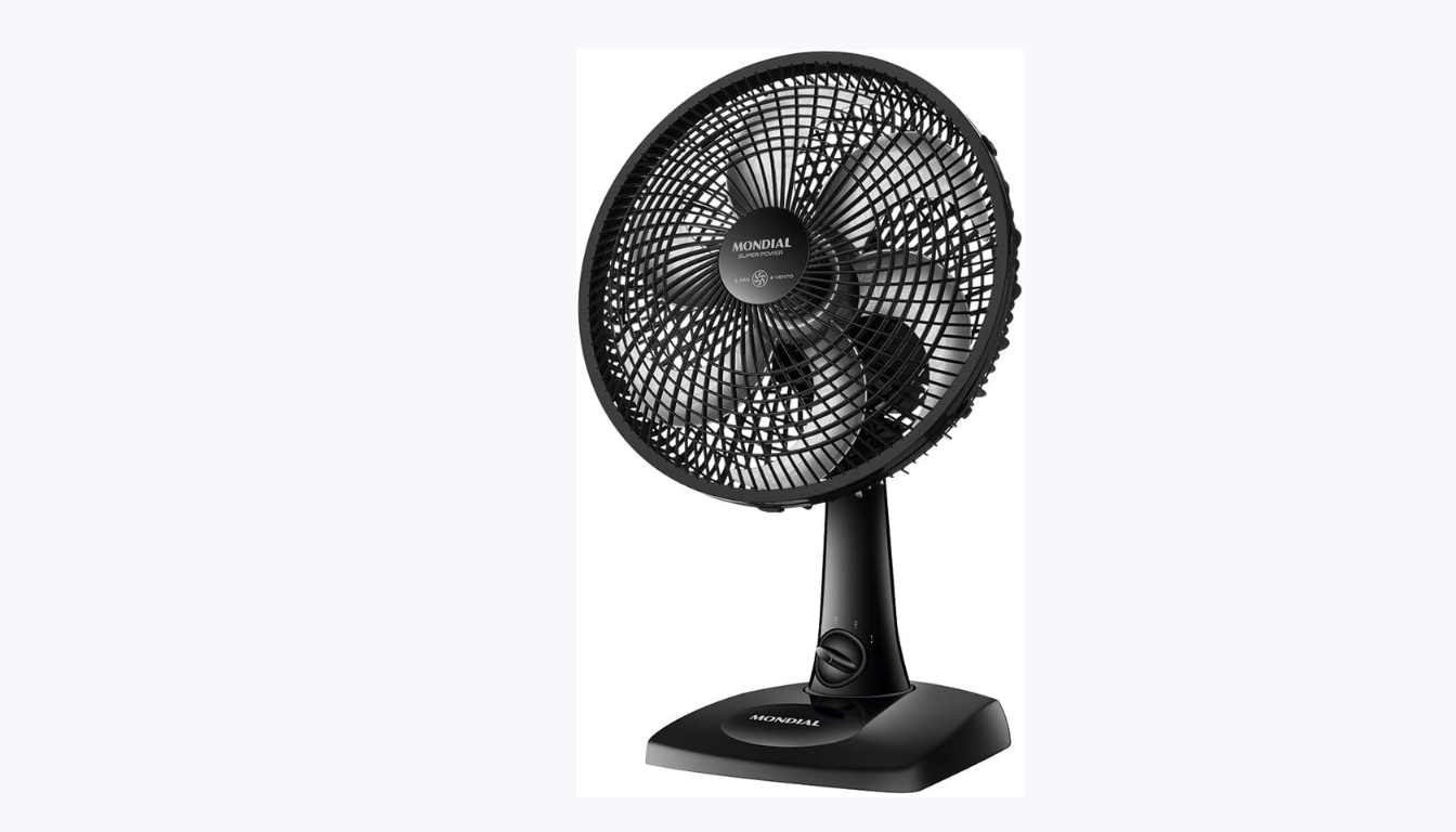 Em segundo lugar, está o ventilador de mesa Mondial 6 Pás Turbo. É um modelo prático, leve e que não gasta muita energia, combinando eficiência com um ótimo custo-benefício. Ele tem classificação A e B no selo Procel, ajudando a refrescar o ambiente sem aumentar muito a conta de luz. Sua hélice de 30 cm com seis pás move bem o ar, especialmente em quartos e salas de tamanho médio. Pesando só 2,1 kg, ele é fácil de carregar e desmontar, o que facilita a limpeza. Os consumidores elogiam seu design moderno, potência e funcionamento silencioso. Ele atende bem às necessidades de espaços menores. Recebeu 4,7 de 5 estrelas e custa cerca de R$ 130.