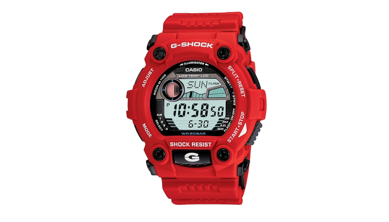 Começando nossa lista, temos o G-Shock Digital G-7900A-4. Esse modelo junta resistência, estilo e várias funções. Ele foi pensado para quem curte esportes aquáticos, com gráficos de maré e fases da lua. E o legal é que ele continua funcionando bem mesmo em temperaturas bem baixas. Como todo bom G-Shock, ele é resistente à água e a impactos, garantindo que dure em qualquer situação. O design é moderno e esportivo, com quatro botões fáceis de usar para acessar as funções. A tela LCD é maior que a de outros modelos, o que ajuda bastante na hora de ler as informações. Ele vem em vermelho, mas também tem em preto, cinza e azul. O G-7900A-4 se destaca pelo visual marcante e pelo acabamento de qualidade. Muita gente elogia o conforto e a versatilidade dele para atividades como surf e natação. As funções extras, como os gráficos de lua e maré, são um diferencial para quem quer mais do que um relógio comum. Ele tem uma nota média de 4,7 de cinco estrelas e custa em torno de R$ 530.