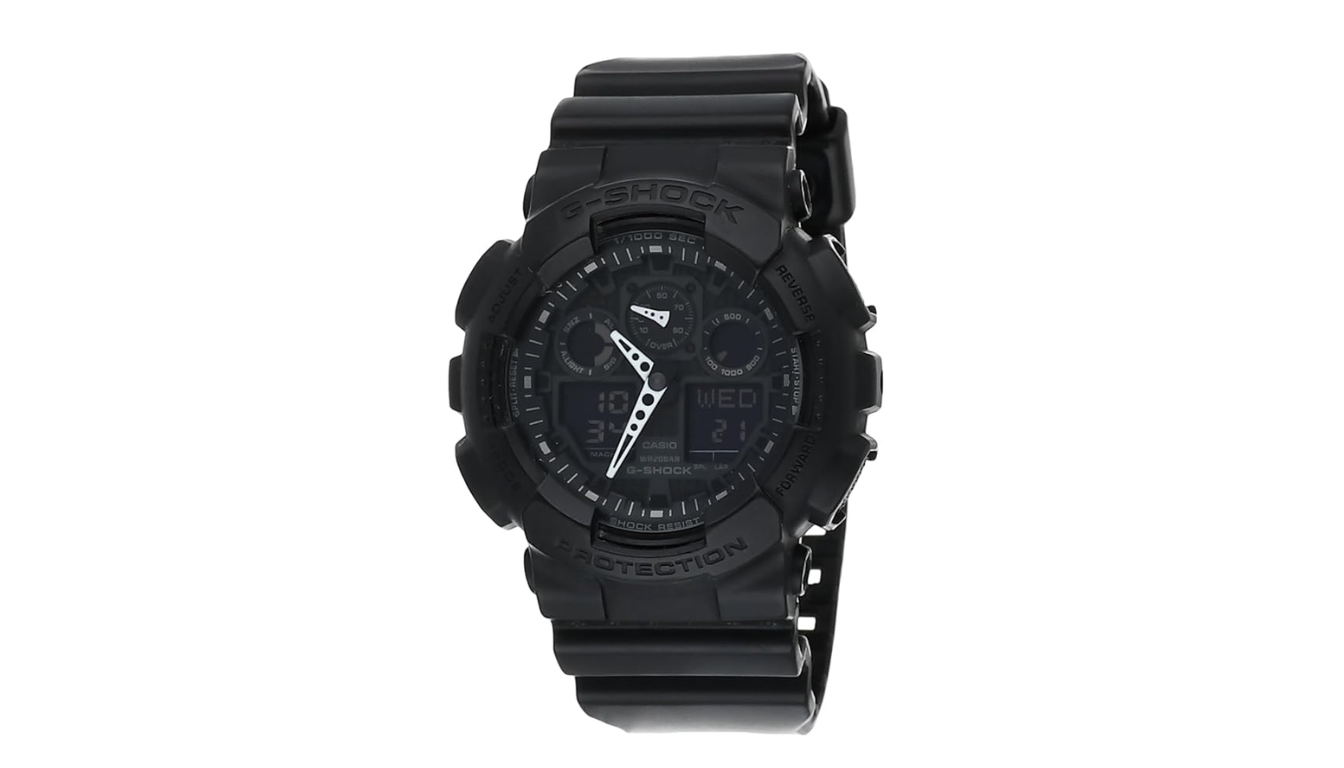 Em segundo lugar, apresentamos o relógio G-Shock Analógico GA-100-1A1. Este modelo combina a elegância do visor analógico com a praticidade do digital. É uma versão híbrida, perfeita para quem quer um relógio completo, moderno e com um visual marcante. Ele se destaca pelo cronômetro de milissegundos, que oferece alta precisão, ideal para acompanhar treinos e corridas. O modelo também tem alarme programável com até cinco opções e iluminação LED laranja, que ajuda a ler o visor em locais com pouca luz. Disponível também em vermelho e branco, o GA-100-1A1 chama a atenção pelo design robusto e pela versatilidade, mantendo a forte identidade da linha G-Shock. Os usuários avaliam muito bem este relógio, destacando o excelente custo-benefício, o conforto no uso diário e a confiabilidade, mesmo em situações complicadas. Com nota média de 4,8 de cinco estrelas, é uma escolha certeira para quem busca unir estilo, resistência e funcionalidade. O preço dele fica em torno de R$ 470.