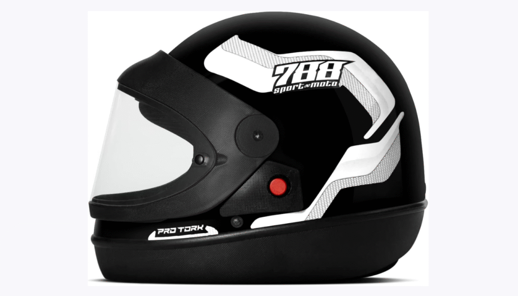 Começando nossa lista em quinto lugar, temos o capacete 788 da Pro Tork. Ele se destaca pela resistência e um bom custo-benefício. É um modelo que une conforto, qualidade e segurança por um preço mais acessível. Fabricado em ABS de alta resistência, conta com isopor interno para melhor absorção de impactos. O forro é antialérgico, ajudando a evitar fungos e bactérias, e a cinta jugular tem fechamento micrométrico. A viseira transparente em policarbonato tem abertura automática. É uma opção mais em conta, ideal para quem busca economia sem abrir mão da proteção. Ele é certificado pelo Inmetro, o que traz mais confiança. As avaliações dos consumidores são ótimas, com uma média de 4,5 estrelas. O preço fica em torno de R$ 120.